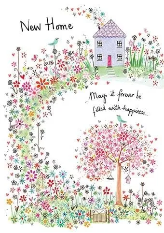 New home card with an image of a pretty flowers and a house. Finished with silver foil detail. Made in the UK.