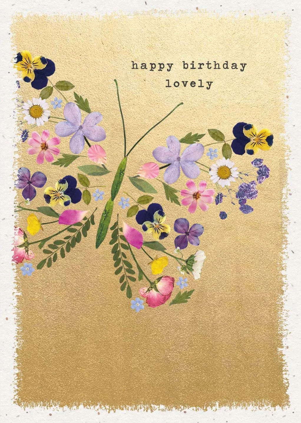 Beautiful floral butterfly birthday card set on a gold foil background.